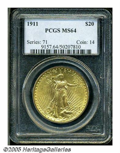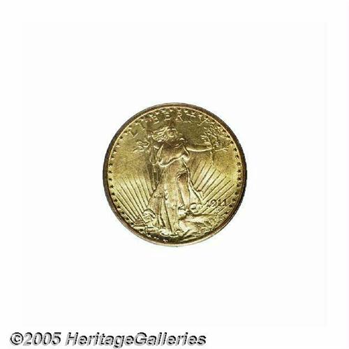 <B>1911<$20> MS64 PCGS.</B></I> Bright, granular surfaces struck in rich yellow-gold. A bit of striking flatness is noted on Liberty's knee and belly, however, there are no mentionable marks or abrasions. Legitimately scarce in grades of MS64 or higher.