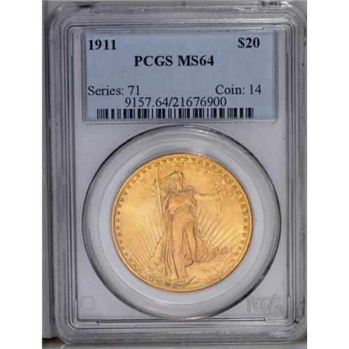 <B>1911<$20> MS64 PCGS.</B></I> Green-gold shades visit the fields, while the devices are adorned in pale apricot hues. Luster sweeps this lightly abraded near-Gem. The strike is unassailable. Less than 200,000 pieces were struck, a mintage much smaller than the two branch mint emissions for the year.
