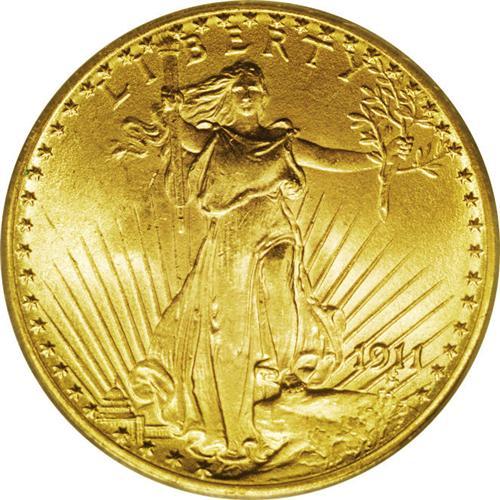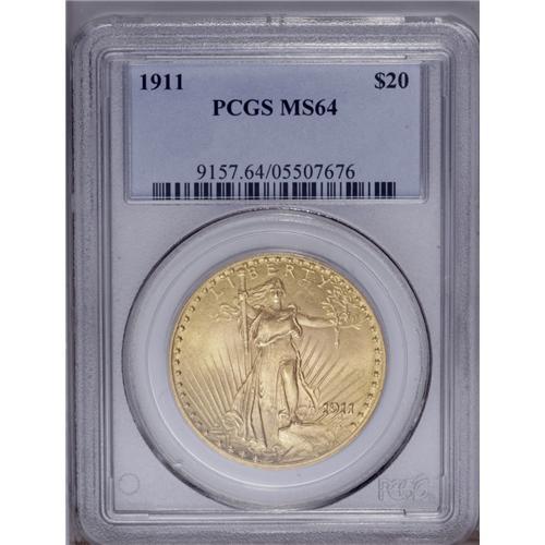 <B>1911 $20 MS64 PCGS.</B></I> Scarce in this superior state of preservation, the fine-grain surfaces show an overlay of satiny luster and are fully struck as well. Minimally abraded for the grade, some subtle green-gold color shows near the borders.