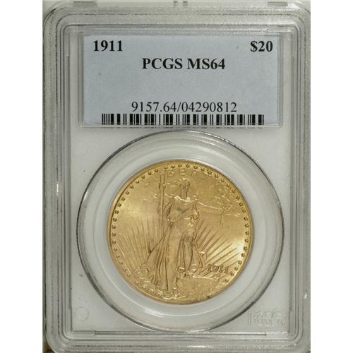 <B>1911 $20 MS64 PCGS.</B></I> The 1911 is an elusive date in higher Mint State grades, and very scarce any finer than this example. With fewer than 200,000 pieces minted, the available Choice population is not so large as one might think. The surfaces are frosty and lustrous with attractive light yellow-gold color, and the strike is above-average.<BR><BR><b>Shipping:</b> Coin/Currency (<a target="_blank" href="http://www.heritageauctions.com/common/shipping.php">view shipping information</a>)