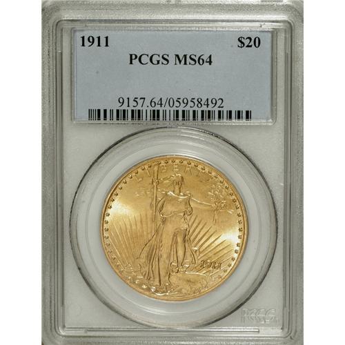 <B>1911 $20 MS64 PCGS.</B></I> The excellent luster and lovely color impart a premium appearance to this near-Gem piece, with the frosty, mattelike surfaces and bold strike completing the equation. A few scattered marks preclude an MS65 grade, but this piece offers much eye appeal. An elusive issue in Gem condition.<BR><BR><b>Shipping:</b> Coins & Currency (<a target="_blank" href="http://www.heritageauctions.com/common/shipping.php">view shipping information</a>)