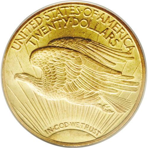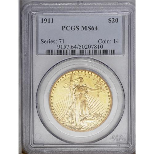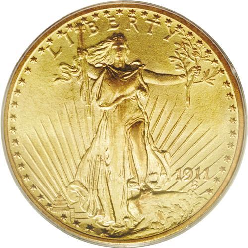 <B>1911<$20> MS64 PCGS.</B></I> The radiant apricot-gold surfaces are faintly matte-like, as made. A bit of striking flatness is noted on Liberty's knee and belly, but the only detectable mark is inconspicuously located on the wing. The 1911 is the first date in a five-year run of low mintage Philadelphia issues, and is seldom seen above the MS64 level.