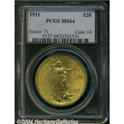 <B>1911<$20> MS64 PCGS.</B></I> A superior example of this date, with refreshing satiny fields displaying bright green-gold mint color, sharply struck details, and pleasantly unabraded compared to most similar coins. Challenging to find in higher grades. <BR><BR><B>Important notice:</B> Heritage usually auctions material at the rate of 200-250 lots per hour. On some occasions eBay Live bid software or the Internet may not be able to keep up with the pace of the auction. We recommend placing a realistic absentee bid now as insurance to avoid disappointment. Occasionally the auctioneer may eliminate or reject an eBay Live bid, and the auctioneer may also reopen a lot after the close of the eBay live bidding (usually because we missed an audience bid), and may reject your bid even if it shows you as the winning bidder. By bidding via eBay Live, you agree that Heritage may award the lot to another bidder at its sole discretion under the circumstances described above or any other reasonable circumstances. Since eBay bids are not shown to us until we open the lot on the floor, we treat those bids just like floor bids. In most cases the floor responds before the eBay bid is presented to us, due to Internet lag time, so for consistency we have made it a policy that floor bids are always considered first over tie eBay live bids. Also please note that all Heritage lots purchased through eBay Live carry a 20% Buyer's Premium. Please make sure you read the Terms and Conditions before you bid. </span></font></tr></table></td></tr></table>