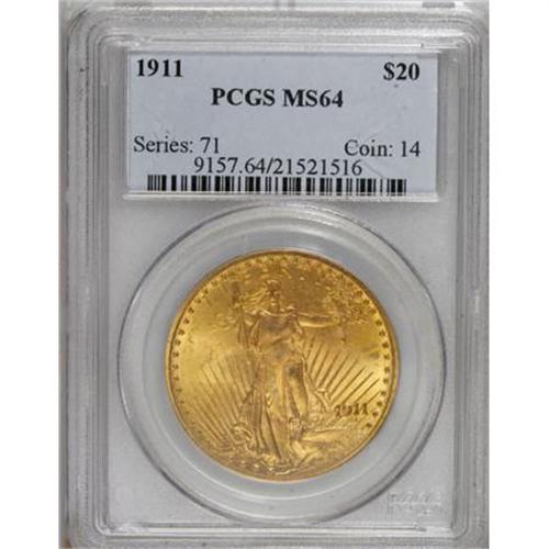 <B>1911 $20 MS64 PCGS.</B></I> Luster sweeps the green-gold fields and devices of this crisply impressed better date double eagle. Generally smooth, although determined scrutiny with a loupe finds concealed marks on the devices. Fewer than 200,000 pieces were struck, a feature common to all Philadelphia issues between 1911 and 1915.<BR><BR><B>Coin Engraver:</B> Augustus Saint-Gaudens<BR><BR><b>Shipping:</b> Coins & Currency (<a target="_blank" href="http://www.heritageauctions.com/common/shipping.php">view shipping information</a>)
