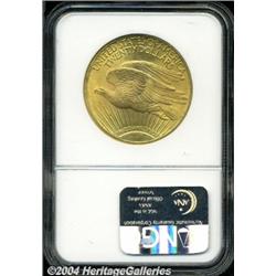 <B>1911<$20> MS66 NGC.</B></I> With a mintage of 197,350 pieces one would think the 1911 would be more available in high grades than it is. The fact is, it is very elusive in Gem (MS65) condition, and as an MS66, only 11 pieces have thus far been graded by both services combined, with 1 finer (4/04). Fully struck throughout, the rich orange-gold surfaces show excellent luster characteristics and there are no mentionable abrasions on either side. <BR><BR><B>Important notice:</B> Heritage usually auctions material at the rate of 200-250 lots per hour. On some occasions eBay Live bid software or the Internet may not be able to keep up with the pace of the auction. We recommend placing a realistic absentee bid now as insurance to avoid disappointment. Occasionally the auctioneer may eliminate or reject an eBay Live bid, and the auctioneer may also reopen a lot after the close of the eBay live bidding (usually because we missed an audience bid), and may reject your bid even if it shows you as the winning bidder. By bidding via eBay Live, you agree that Heritage may award the lot to another bidder at its sole discretion under the circumstances described above or any other reasonable circumstances. Since eBay bids are not shown to us until we open the lot on the floor, we treat those bids just like floor bids. In most cases the floor responds before the eBay bid is presented to us, due to Internet lag time, so for consistency we have made it a policy that floor bids are always considered first over tie eBay live bids. Also please note that all Heritage lots purchased through eBay Live carry a 20% Buyer's Premium. Please make sure you read the Terms and Conditions before you bid.