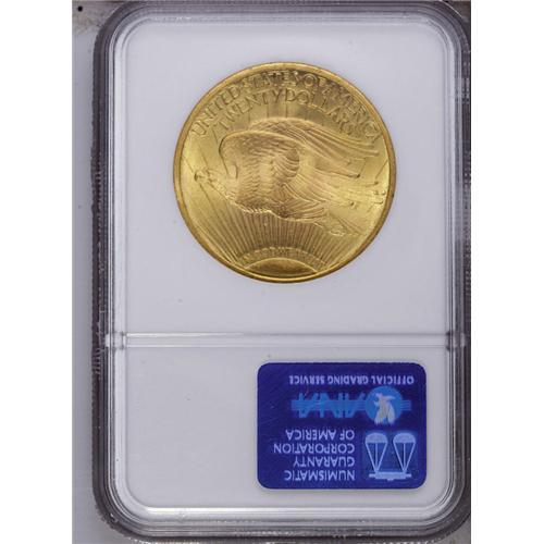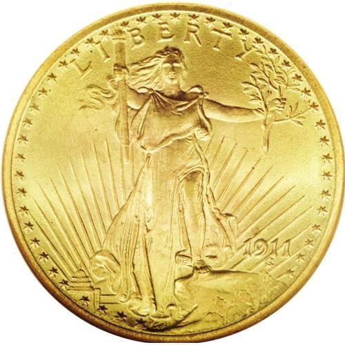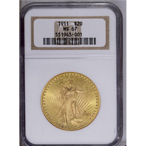 <B>1911<$20> MS67 NGC.</B></I> A remarkably preserved Superb Gem, and one of only two pieces certified as MS67 by NGC (2/06). We also sold the other MS67 example last summer in our July ANA Signature Sale. None have been certified this high by PCGS. A bold strike enhances the exceptionally smooth, matte-like surfaces. The details on the Capitol building, the olive branch, Liberty's fingers on both hands, and the eagle's tail feathers are all sharply struck up. A pronounced green-gold finish overlies each side, as is typical for the 1911 double eagle. This pleasant coloration adds immense eye appeal. A small toning spot above the 1 and 9 of the date provides a pedigree identifier.