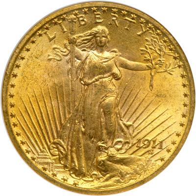 1911 $20 St. Gaudens. NGC graded MS-64. Delicate golden hues adds to its appeal. Low mintage, high value date to collectors of this important series. This is a blemish-free case in point of the '11-P in this desirable grade: sleek gold in color, with mint bloom that grabs hold of the satiny effect seen in careful preservation since it was made. Adding to those results, a word about strike: this piece has all but needle-sharp devices, with gorgeous detail on the face and sandal, the eagle's breast and wings (PCGS # 9157) .