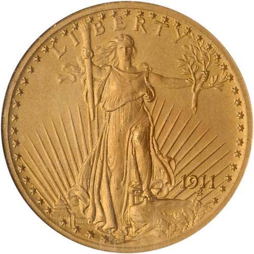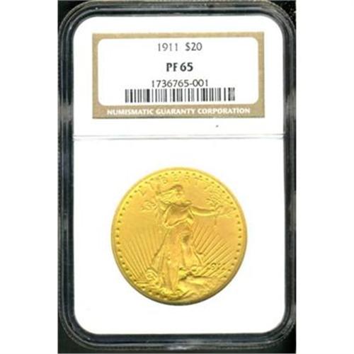 <b>1911 $20 St. Gaudens. NGC graded Proof 65.</b> Pop: 13/30. Once again, even though the official Philadelphia Mint shows 100 pieces made this year, this is really less than a meaningful number because so few are known today. Apparently the mint produced, on speculation, small numbers of these unusual Matte Proofs each year. The public lacked enthusiasm about Matte Proofs, however; as a result, few were ordered and even fewer survive today in Gem condition. Estimates of survivors for this date range up to as many as 25-35 separate individuals (in all grades).