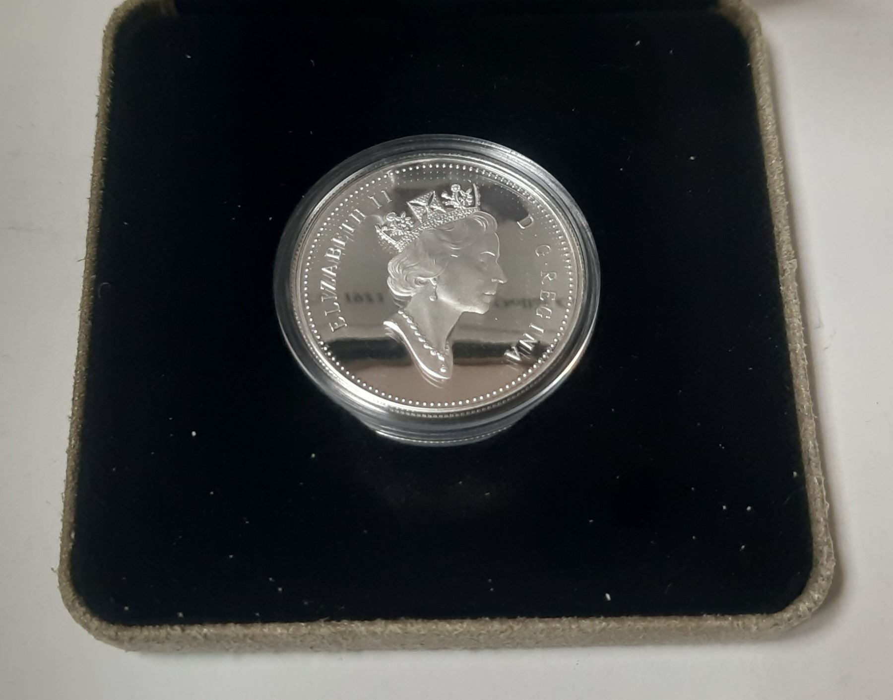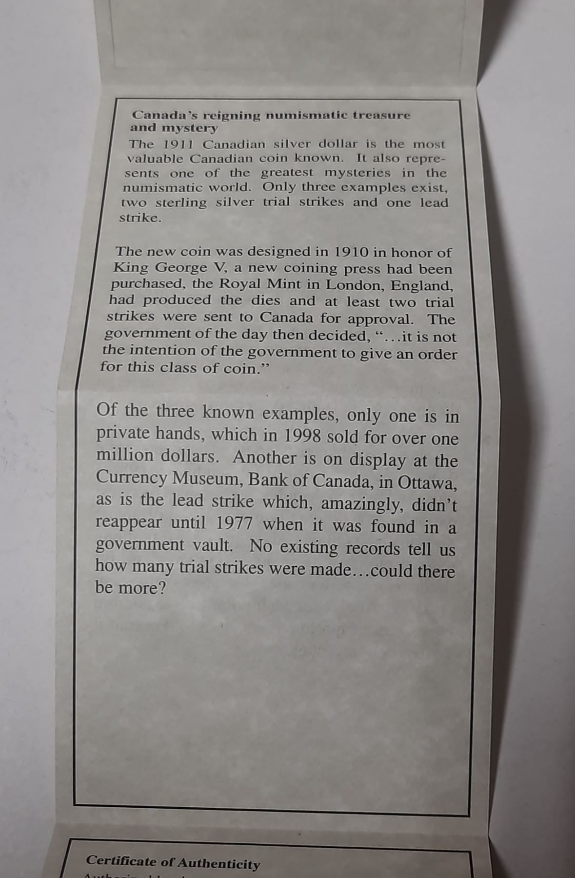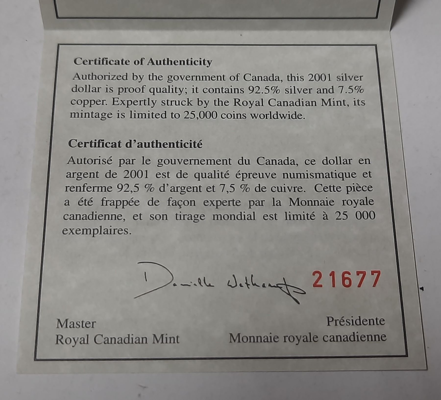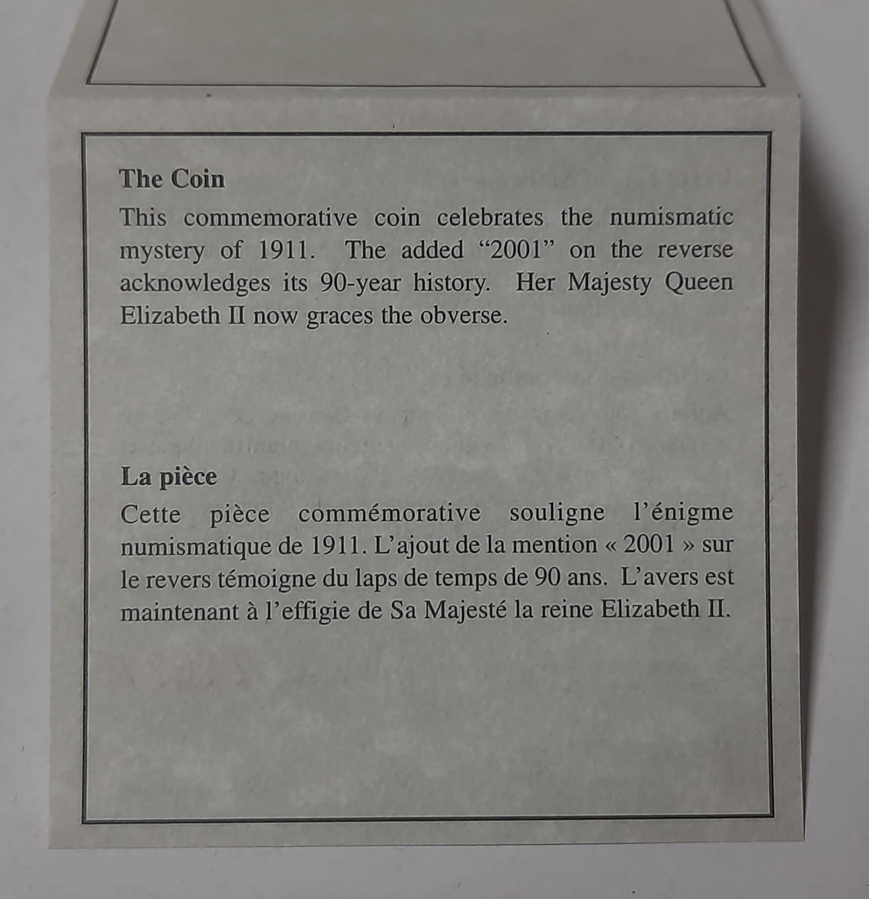 1911 – 2001 Canadian Silver Dollar. Commemorates the 90th Anniversary of the first Pattern Canadian Silver Dollar, minted in 1911. The original 1911 silver dollars are the rarest and most expensive Canadian coins. Proof with Ultra Heavy Cameo. Housed in its original RCM case, plus COA.