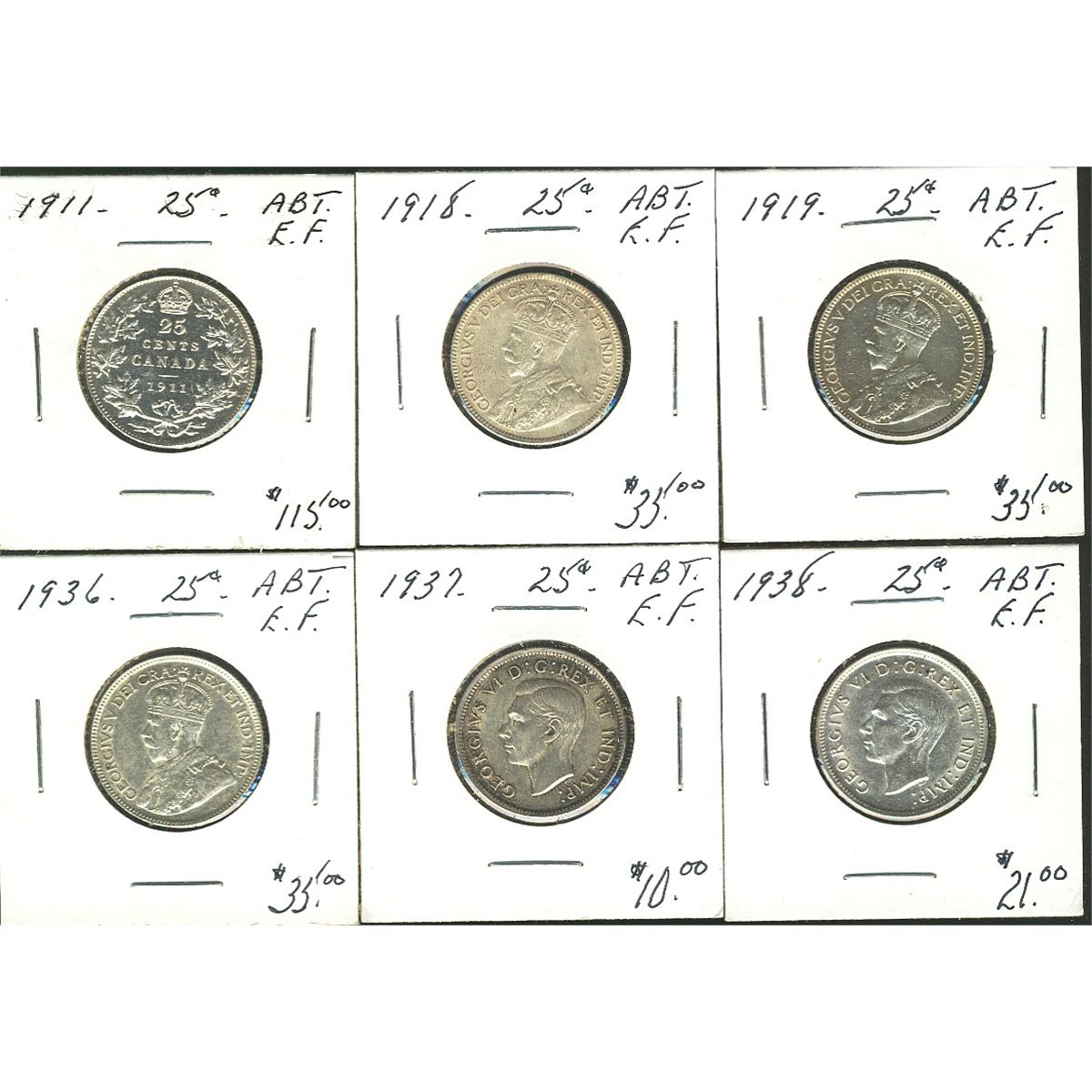 1911 25¢, 1918, 1919, 1936, 1937 & 1938. Lot of 6 coins all Abt EF. (PBA).