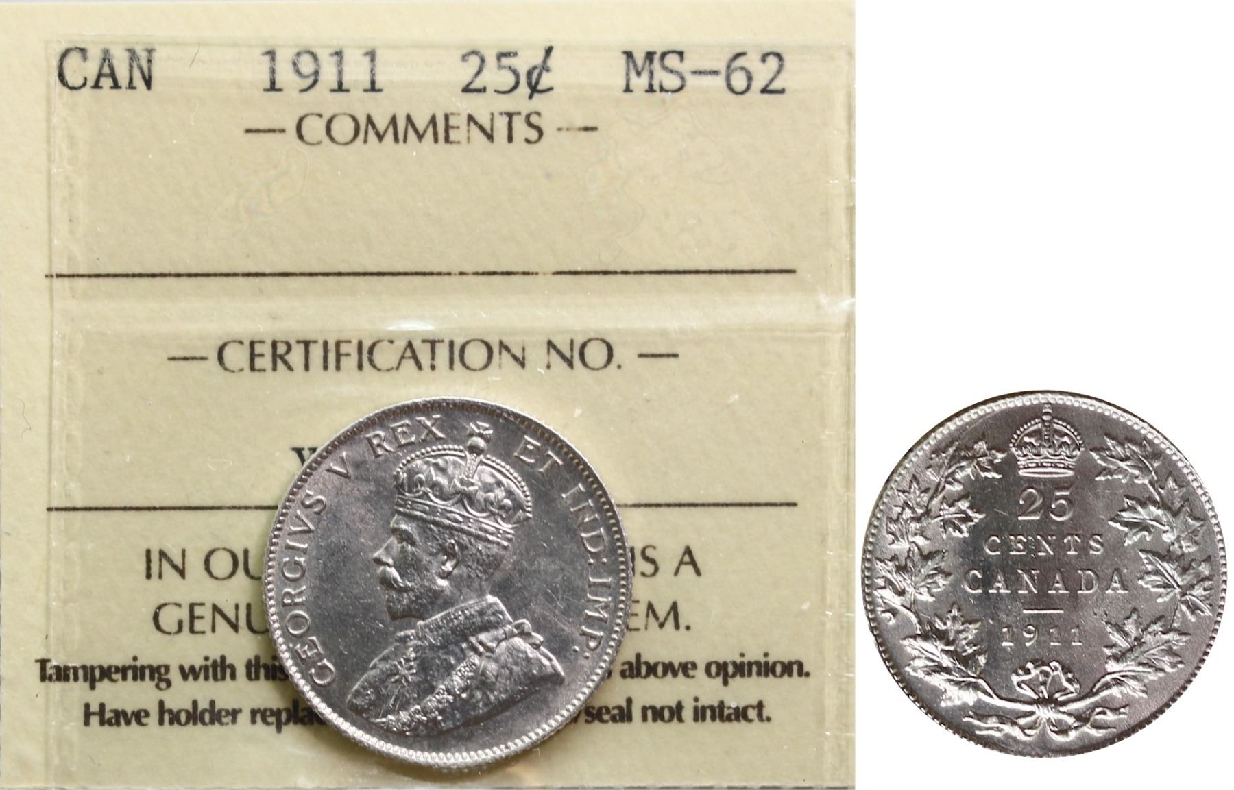 1911 25¢ ICCS Choice Mint State-62