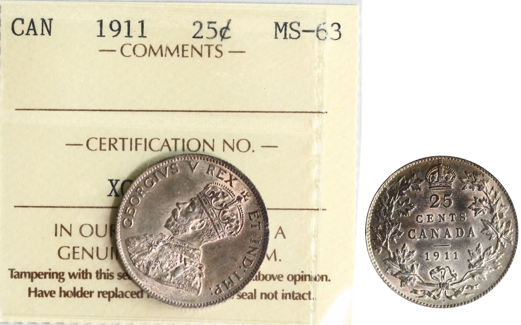 The cataloguer has taken every reasonable measure to ensure that all of the lots in this sale are as described and genuine. All raw coins and banknotes have been graded by the cataloger or the auction house which represent our best professional opinion. To grade coins and banknotes, we use Canadian grading standards, 42 years of experience and good conscience. However, grading is a subjective description in the opinion of the cataloger or the auction house. Among experts there are often differences of opinion on the grading and the eye appeal of a coin. The strike and the state of preservation are often debated. The Canadian Numismatic Company acts as an agent between consignors and buyers. The Canadian Numismatic Company does not guarantee that any coin or banknote cataloged will meet the standards, or the grade, of any third party grading companies. No warranty, whether impressed or implied. Items are as is, no warranty given. We cannot accept responsibility and waive all liability resulting in financial losses, and or incidentals accruing from the sale of any items, nor can we guarantee that items graded by third party services will grade the same if submitted to a different grading service or re-submitted to the same company. Statements by The Canadian Numismatic Company regarding the condition, the eye appeal, the strike and the population of items are for guidance only. All lots offered are sold "AS IS". Title to all lots remains with the auction house until paid for in full by the purchaser. But they are held at the risk of the purchaser once the time of the sale.