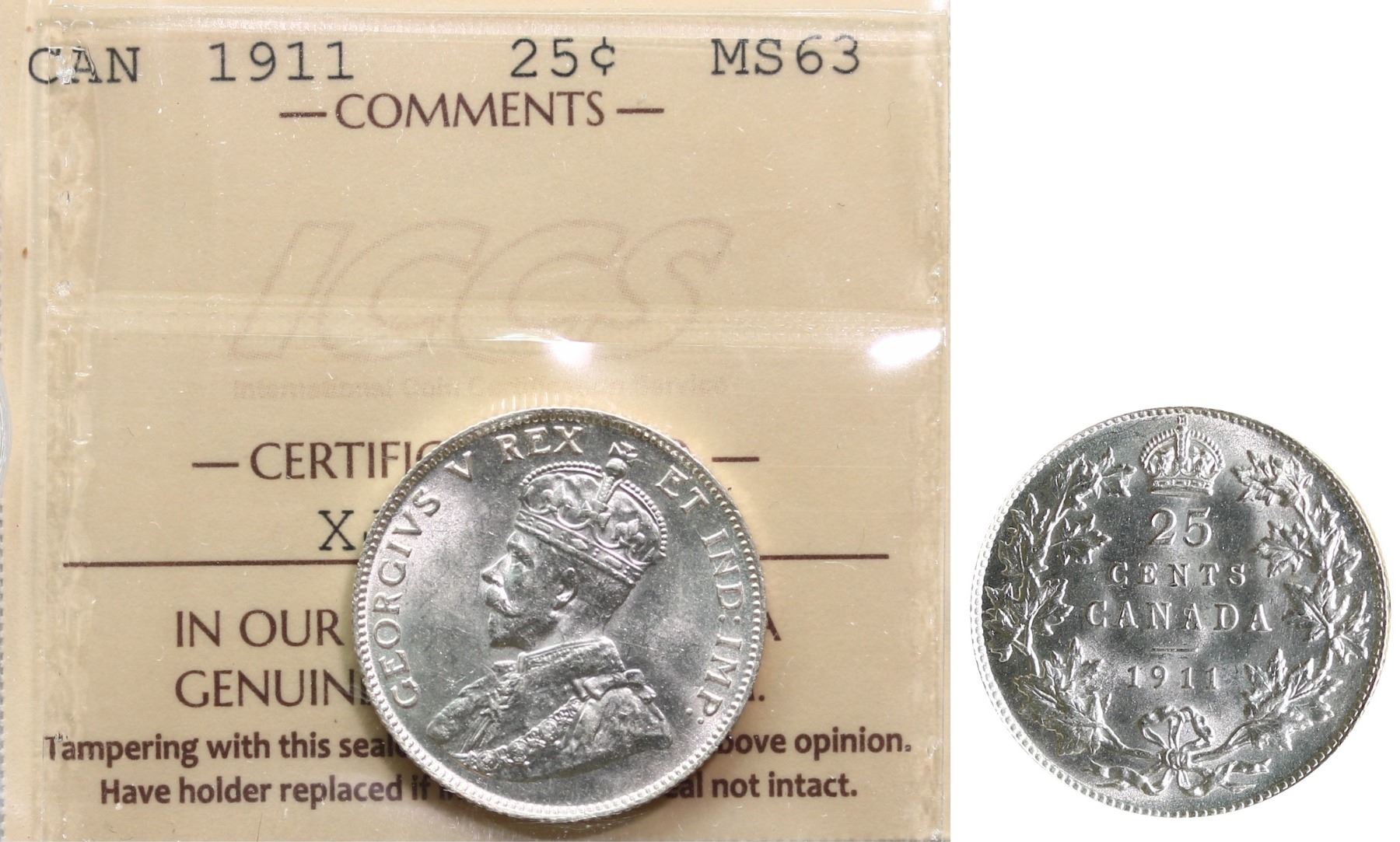 1911 25¢ ICCS Choice Mint State-63 Fully brilliant and lustrous. A very nice Geeorge V type coin.