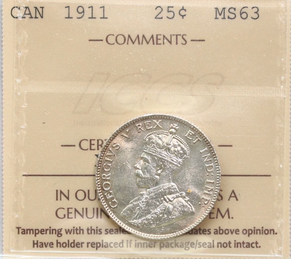 1911 25¢ ICCS Choice Mint State-63 Fully lustrous and brilliant with a hint of golden tone.