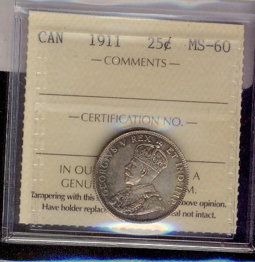 1911 25¢ ICCS MS60. Nice lustre and greenish tone.