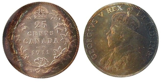 1911 25¢ ICCS MS63.Obv shows strong golden tones with reverse showing strong lustre and rim tones.