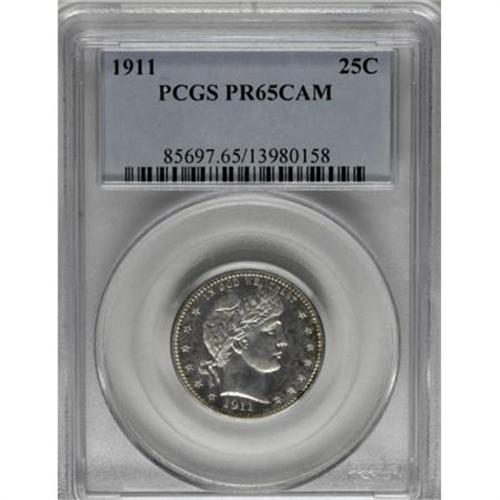 <B>1911 25C PR65 Cameo PCGS.</B></I> Pronounced field-motif cameo contrast is apparent on both sides of this beautiful Gem. Frosty design elements have been sharply defined by a well executed strike, and well preserved surfaces reveal dapples of light purple color. Population: 11 in 65 Cameo, 16 finer (8/07).<BR><BR><b>Shipping:</b> Coins & Currency (<a target="_blank" href="http://www.heritageauctions.com/common/shipping.php">view shipping information</a>)
