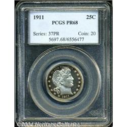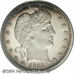 <B>1911<25C> PR68 PCGS.</B></I> Golden-brown and electric-blue patina endows the peripheries of this otherwise brilliant Superb Gem. The icy-white portrait appears to provide obvious cameo contrast, although PCGS has not seen fit to designate the specimen as such. Well struck, only the eagle's right (facing) claw and the very bottom of fletchings does not possess exquisite definition. Intense examination of the exceptionally preserved surfaces reveals only a tiny carbon fleck atop the right (facing) wing. A scant 543 pieces were struck, and specimens with the lovely toning and exemplary quality of the present piece are very few in number.<BR><I>From the JFS Collection.</B></I> <BR><BR><B>Important notice:</B> Heritage usually auctions material at the rate of 200-250 lots per hour. On some occasions eBay Live bid software or the Internet may not be able to keep up with the pace of the auction. We recommend placing a realistic absentee bid now as insurance to avoid disappointment. Occasionally the auctioneer may eliminate or reject an eBay Live bid, and the auctioneer may also reopen a lot after the close of the eBay live bidding (usually because we missed an audience bid), and may reject your bid even if it shows you as the winning bidder. By bidding via eBay Live, you agree that Heritage may award the lot to another bidder at its sole discretion under the circumstances described above or any other reasonable circumstances. Since eBay bids are not shown to us until we open the lot on the floor, we treat those bids just like floor bids. In most cases the floor responds before the eBay bid is presented to us, due to Internet lag time, so for consistency we have made it a policy that floor bids are always considered first over tie eBay live bids. Also please note that all Heritage lots purchased through eBay Live carry a 20% Buyer's Premium. Please make sure you read the Terms and Conditions before you bid. </span></font></tr></table></td></tr></table>