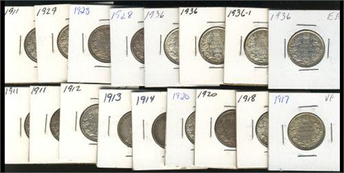 1911 (3), 1912, 1913, 1914, 1917, 1918, 1920 (2), 1928 (2), 1929, 1936 (4). Lot of 17 pieces. Grades vary from F-15 to EF-40.