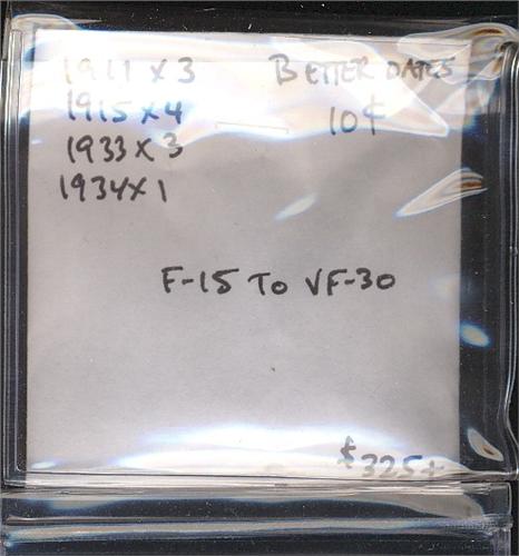 1911 (3), 1915 (4), 1933 (3), 1934. Grades vary from F-15 to VF-30. A nice lot of 11 pieces of semi-key dates.