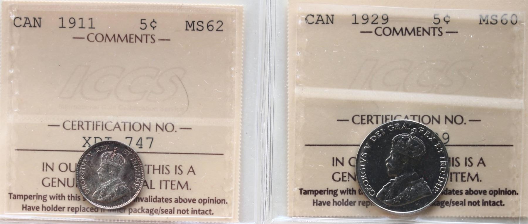 1911 5¢ Choice Mint State-62 & 1929 Mint State-60, Both coins ICCS .