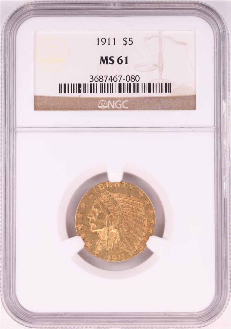 One 1911 $5 Indian Head Half Eagle Coin NGC MS61. NGC Certified.