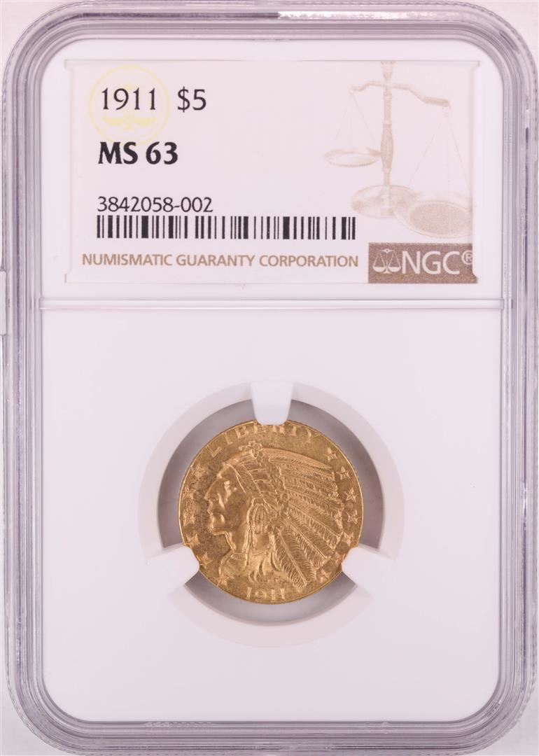 One 1911 $5 Indian Head Half Eagle Coin NGC MS63. NGC Certified.