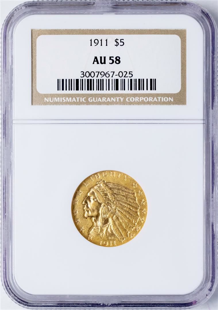 One 1911 $5 Indian Head Half Eagle Gold Coin NGC AU58. NGC Certified.