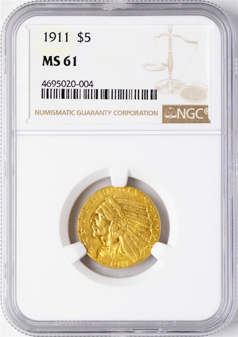 One 1911 $5 Indian Head Half Eagle Gold Coin NGC MS61. NGC Certified.