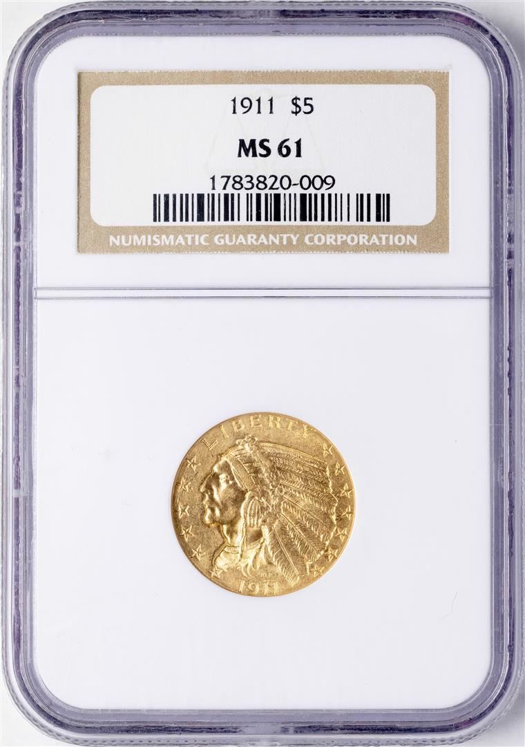 One 1911 $5 Indian Head Half Eagle Gold Coin NGC MS61. NGC Certified.