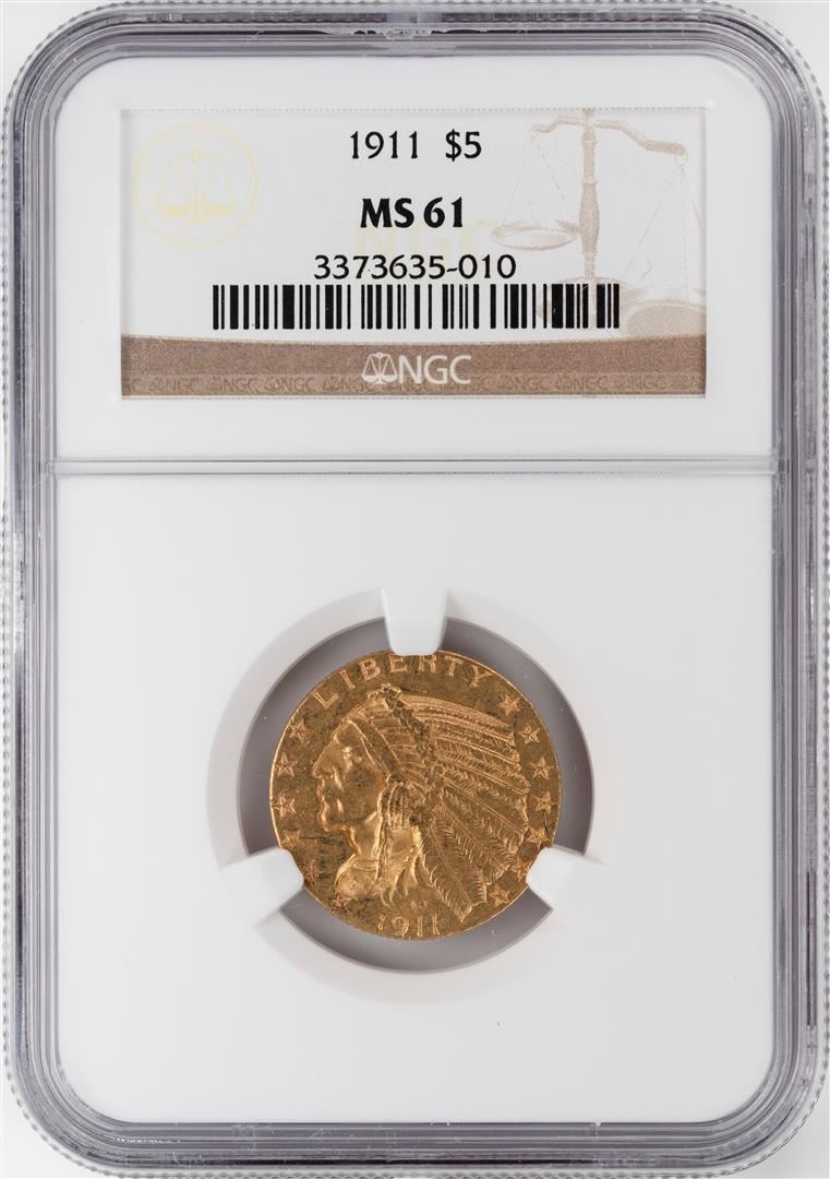One 1911 $5 Indian Head Half Eagle Gold Coin NGC MS61. NGC Certified.