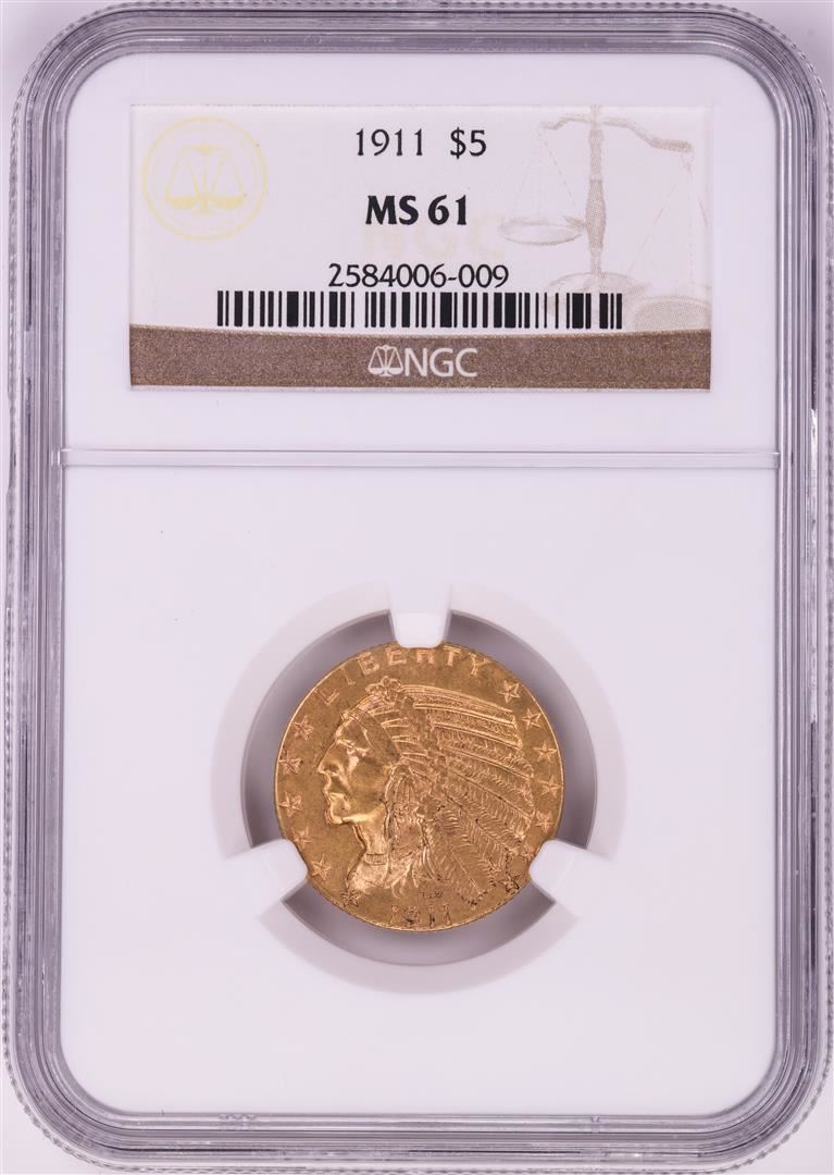 One 1911 $5 Indian Head Half Eagle Gold Coin NGC MS61. NGC Certified.