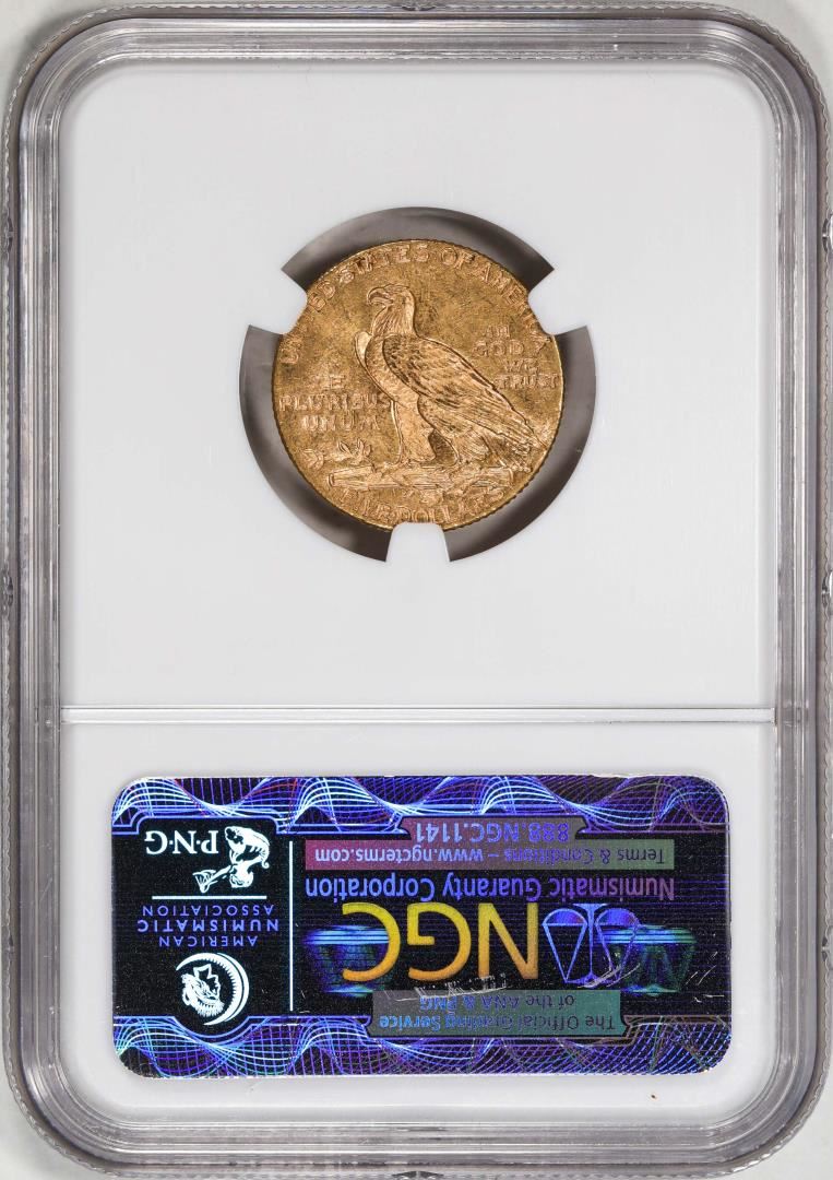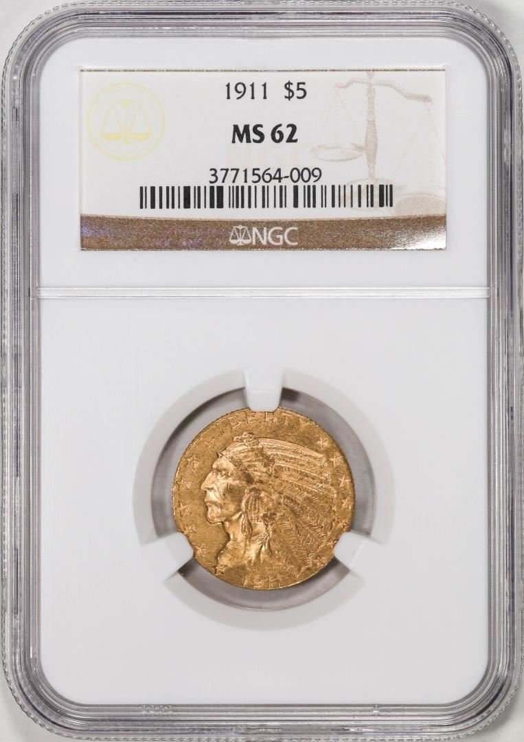 One 1911 $5 Indian Head Half Eagle Gold Coin NGC MS62. NGC Certified.