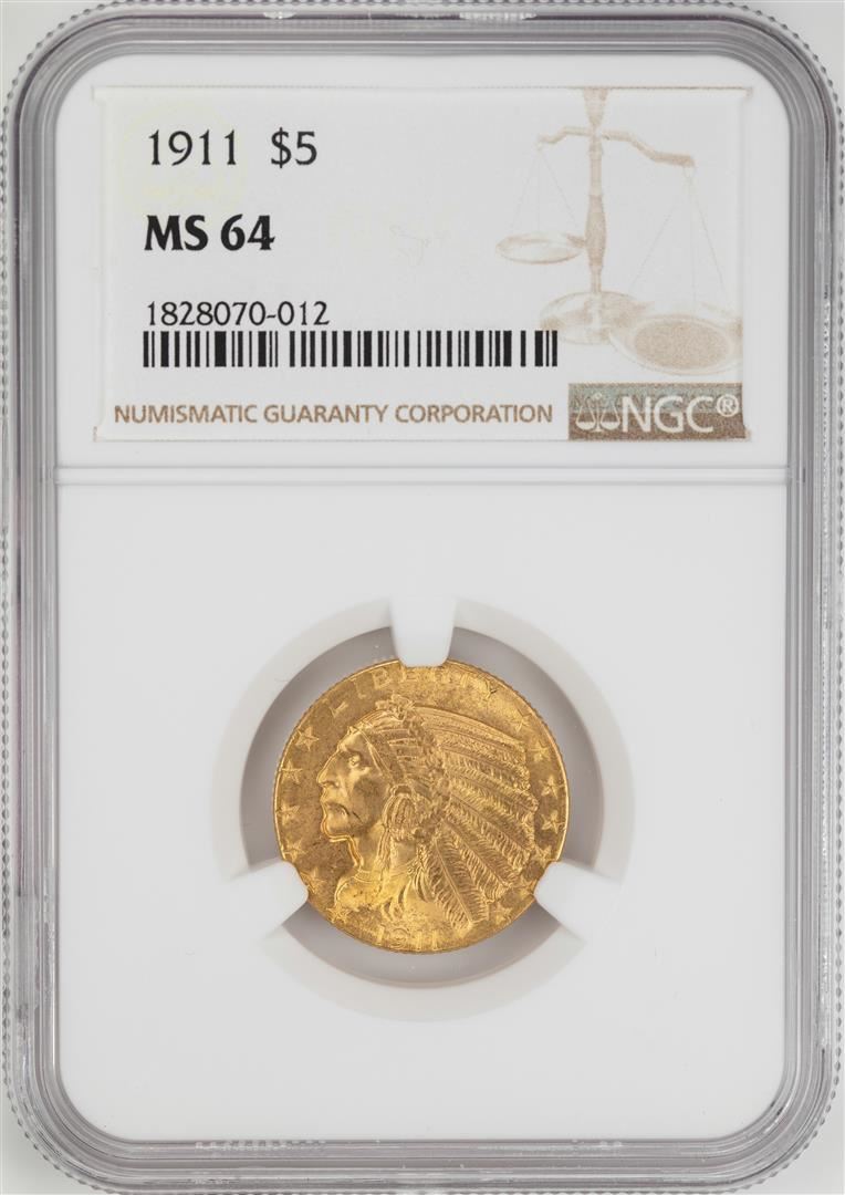 One 1911 $5 Indian Head Half Eagle Gold Coin NGC MS64. NGC Certified.