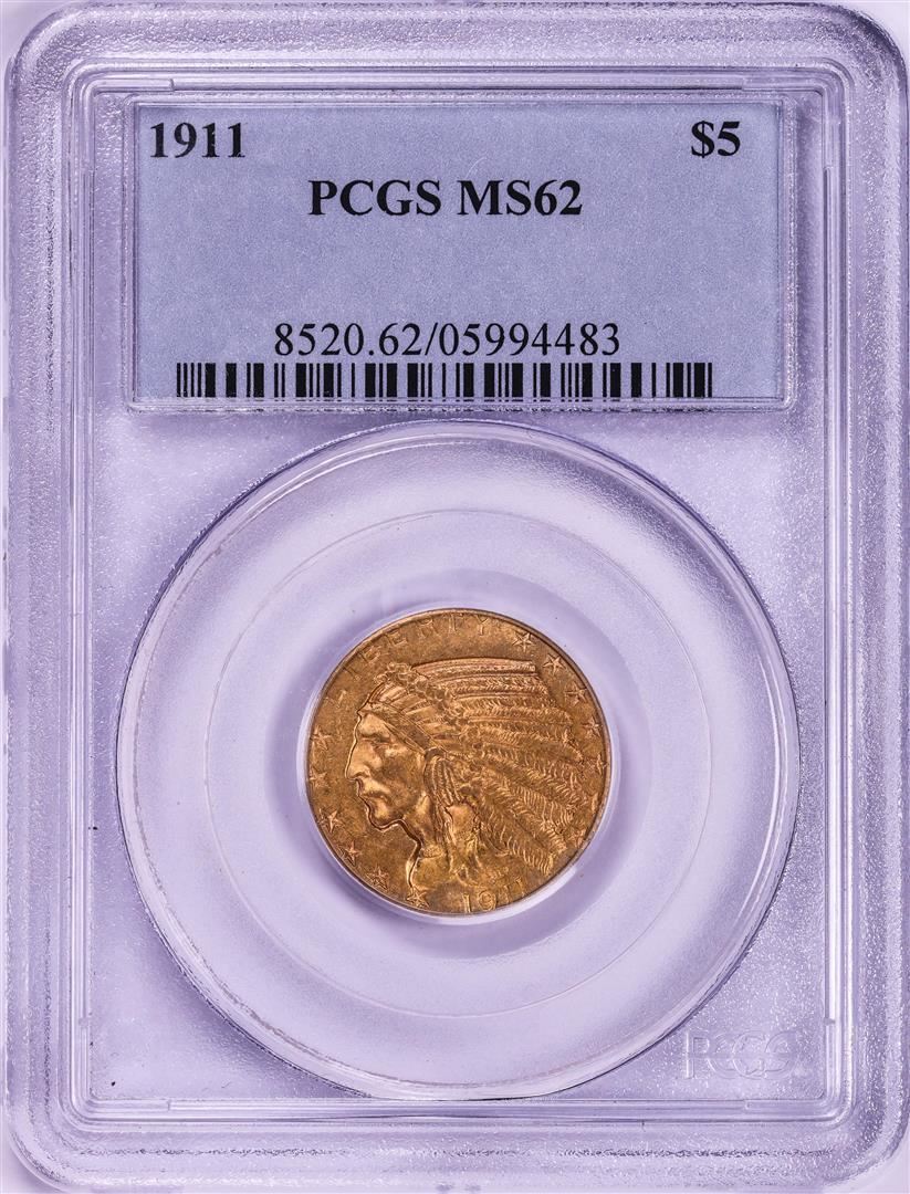 One 1911 $5 Indian Head Half Eagle Gold Coin PCGS MS62. PCGS Graded.