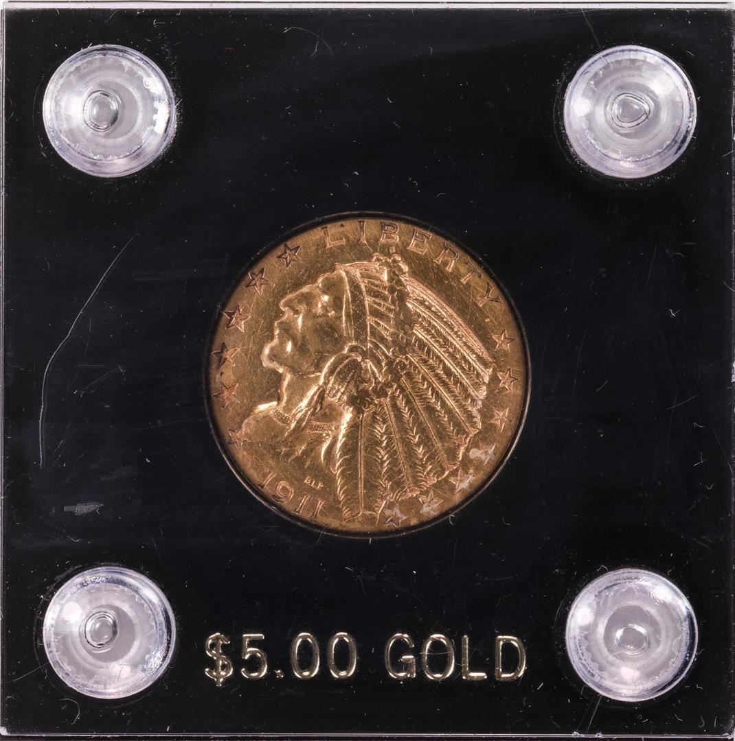 One 1911 $5 Indian Head Half Eagle Gold Coin.