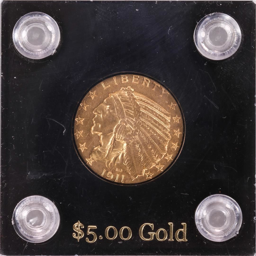 One 1911 $5 Indian Head Half Eagle Gold Coin.