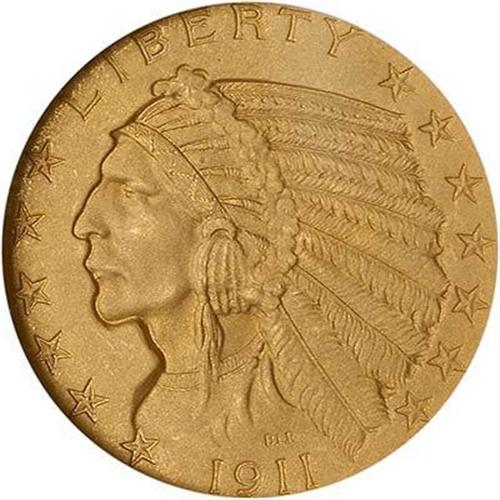This example is extremely sharply struck, as are nearly all Matte Proof gold Indian fives. The surfaces have a wonderful grainy appearance with thousands (millions?) of tiny bright gold pinpoint components when examined under magnification. Nearly flawless with deep flaxen to orange-gold patina over each side. An eye-appealing, radiant Proof specimen.