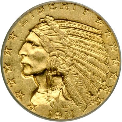 1911 $5 Indian. PCGS graded AU-55. Much luster. Sharp strike. Good eye appeal (PCGS # 8520) .