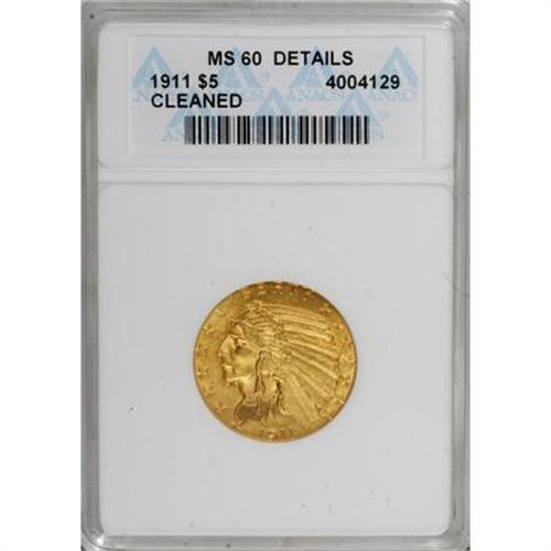 <B>1911 $5 --Cleaned--ANACS. MS60 Details.</B></I> NGC Census: (259/4521). PCGS Population (208/2860). Mintage: 915,000. Numismedia Wsl. Price for NGC/PCGS coin in MS60: $460. (#8520)<BR><BR><B>Coin Engraver:</B> Bela Lyon Pratt<BR><BR><b>Shipping:</b> Coins & Currency (<a target="_blank" href="http://www.heritageauctions.com/common/shipping.php">view shipping information</a>)