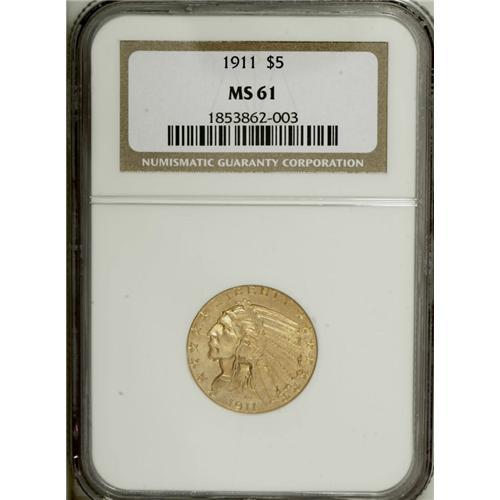 <B>1911 $5 MS61 NGC.</B></I> Soft luster rests over peach-gold surfaces that are tinged with traces of light green, and good definition characterizes the design features. Some minute handling marks are scattered about, especially on the reverse.<BR><BR><b>Shipping:</b> Coins & Currency (<a target="_blank" href="http://www.heritageauctions.com/common/shipping.php">view shipping information</a>)