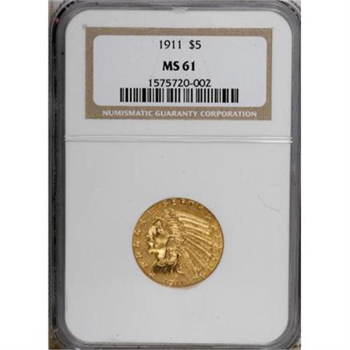 <B>1911 $5 MS61 NGC.</B></I> NGC Census: (1683/2810). PCGS Population (571/2278). Mintage: 915,000. Numismedia Wsl. Price for NGC/PCGS coin in MS61: $535. (#8520)<BR><BR><B>Coin Engraver:</B> Bela Lyon Pratt<BR><BR><b>Shipping:</b> Coins & Currency (<a target="_blank" href="http://www.heritageauctions.com/common/shipping.php">view shipping information</a>)