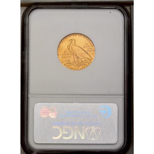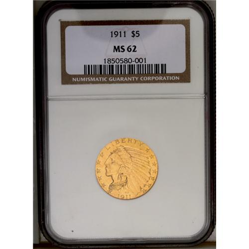<B>1911<$5> MS62 NGC.</B></I> A lovely Mint State example with rich yellow-gold luster and satiny surfaces. Both sides are moderately abraded as expected at this grade level.