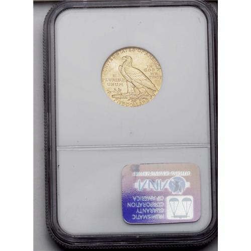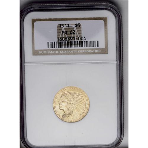 <B>1911<$5> MS62 NGC.</B></I> Boldly struck with bright straw-gold and peach toning and scattered small marks. A pinscratch in the left reverse field is the only singularly mentionable defect. One of the more common issues of this type.