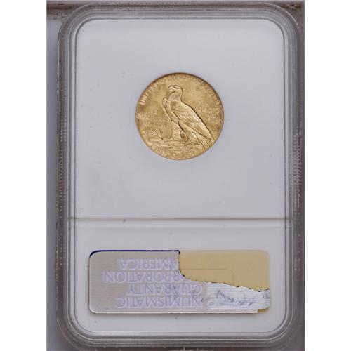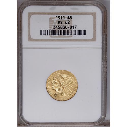<B>1911<$5> MS62 NGC.</B></I> Bright peach-gold surfaces are accented with a few whispers of orange, and the design features are adequately impressed. A couple of minute marks are visible on the Indian's cheek, and in the raised open fields of both sides.