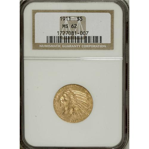 <B>1911 $5 MS62 NGC.</B></I> NGC Census: (1870/869). PCGS Population (1199/963). Mintage: 915,000. Numismedia Wsl. Price for NGC/PCGS coin in MS62: $1,160. (#8520)<BR><BR><b>Shipping:</b> Coins & Currency (<a target="_blank" href="http://www.heritageauctions.com/common/shipping.php">view shipping information</a>)