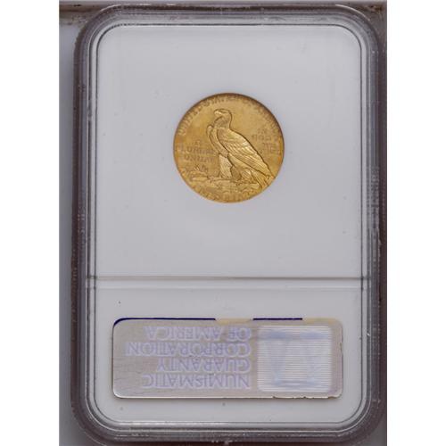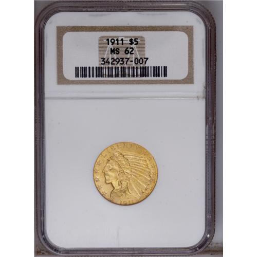 <B>1911<$5> MS62 NGC.</B></I> Peach-gold surfaces display soft luster and sharply struck design features. Several light abrasions are noted in the exposed, open fields.