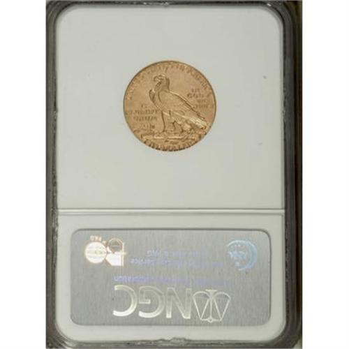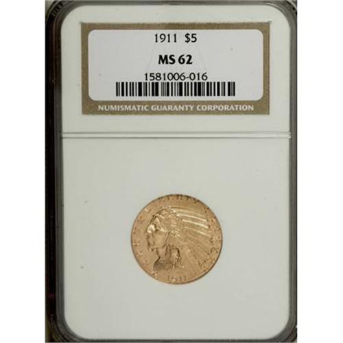 <B>1911 $5 MS62 NGC.</B></I> This attractive type piece shows better-than-average luster and excellent detail. The lightly abraded sun-gold surfaces show a number of faint marks and a handful of significant abrasions.<BR><BR><B>Coin Engraver:</B> Bela Lyon Pratt<BR><BR><b>Shipping:</b> Coins & Currency (<a target="_blank" href="http://www.heritageauctions.com/common/shipping.php">view shipping information</a>)