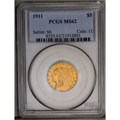 <B>1911<$5> MS62 PCGS.</B></I> The surfaces show a combination of khaki-gray and brassy-gold coloration. Boldly struck with a smooth obverse and a few minor marks on the reverse.