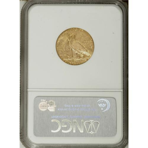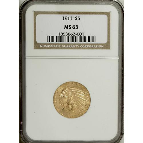 <B>1911 $5 MS63 NGC.</B></I> Certainly one of the more common dates in the Indian half eagle series, but in choice uncirculated condition, all such pieces are in great demand, and notably valued. This specimen is no exception, possessing frosted surfaces and attractive luster.<BR><BR><b>Shipping:</b> Coin/Currency (<a target="_blank" href="http://www.heritageauctions.com/common/shipping.php">view shipping information</a>)